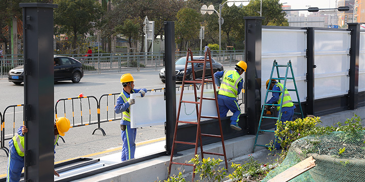 每種施工圍擋款式采用不同的現(xiàn)代美學視覺設計,立柱頂部或側(cè)面均可安裝各種造型美觀的路燈,墻體采用易保潔的圍擋專用材料,表面工地灰塵用清水沖洗即可,依然靚麗如新。